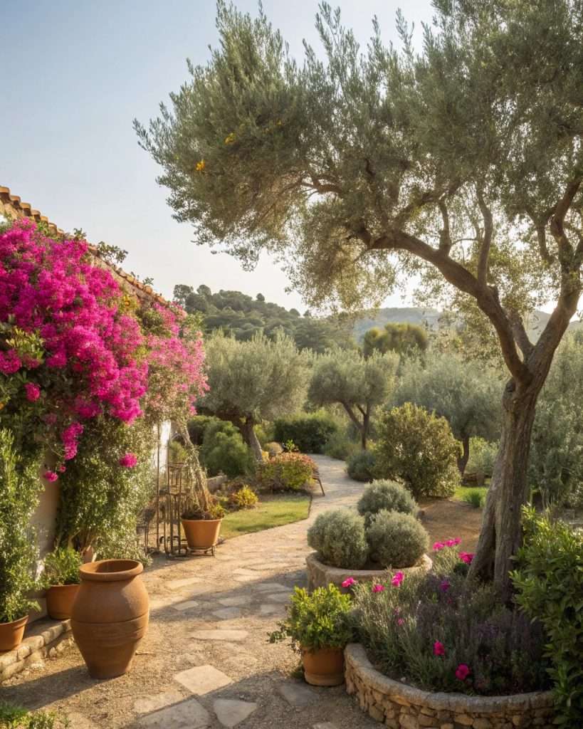 Envisagez de planter des oliviers ou des agrumes pour ce style classique.